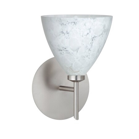 1SW-177919-SN Finish: Satin Nickel, Shade Color: Carrera Features: -One light wall sconce.-Installs directly to a 4'' octagonal outlet box.-Handcrafted glass.-ETL listed.-Suitable for damp locations (interior use only).-Canopy diameter: 5''. Includes: -Accommodates (1) 40W G9 halogen bulb (included). Construction: -Steel construction. Dimensions: -Shade: 4.5'' H x 5'' W x 5'' D.-Overall dimensions: 8.5'' H x 5'' W x 6'' D. Collection: -Mia collection. Warranty: -Manufacturer provides one year warranty.