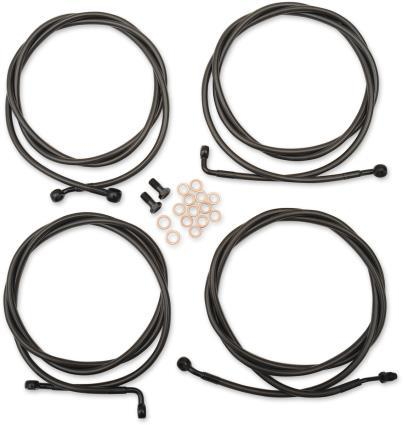 Kits include the correct length brake/ clutch lines and wire extensions to complete a handlebar swap; electrical wire extensions not included (available separately).<br> Stainless braided kits include clutch line, brake lines, chrome T brake line junction, banjo bolts, fittings and copper crush washers.<br> Black vinyl/ stainless kits include black vinyl clutch line and black stainless brake lines with chrome fittings, banjo bolts and crush washers.<br> The midnight kits include stainless steel brake lines and clutch lines covered in a black smoke tinted coating with pure black fittings throughout; lines appear graphite or carbon fiber in appearance providing that ultra custom look and the black fittings seamlessly blend with blacked out controls and covers on the bike.<br> For use with 18in.-20in. Ape Hangers