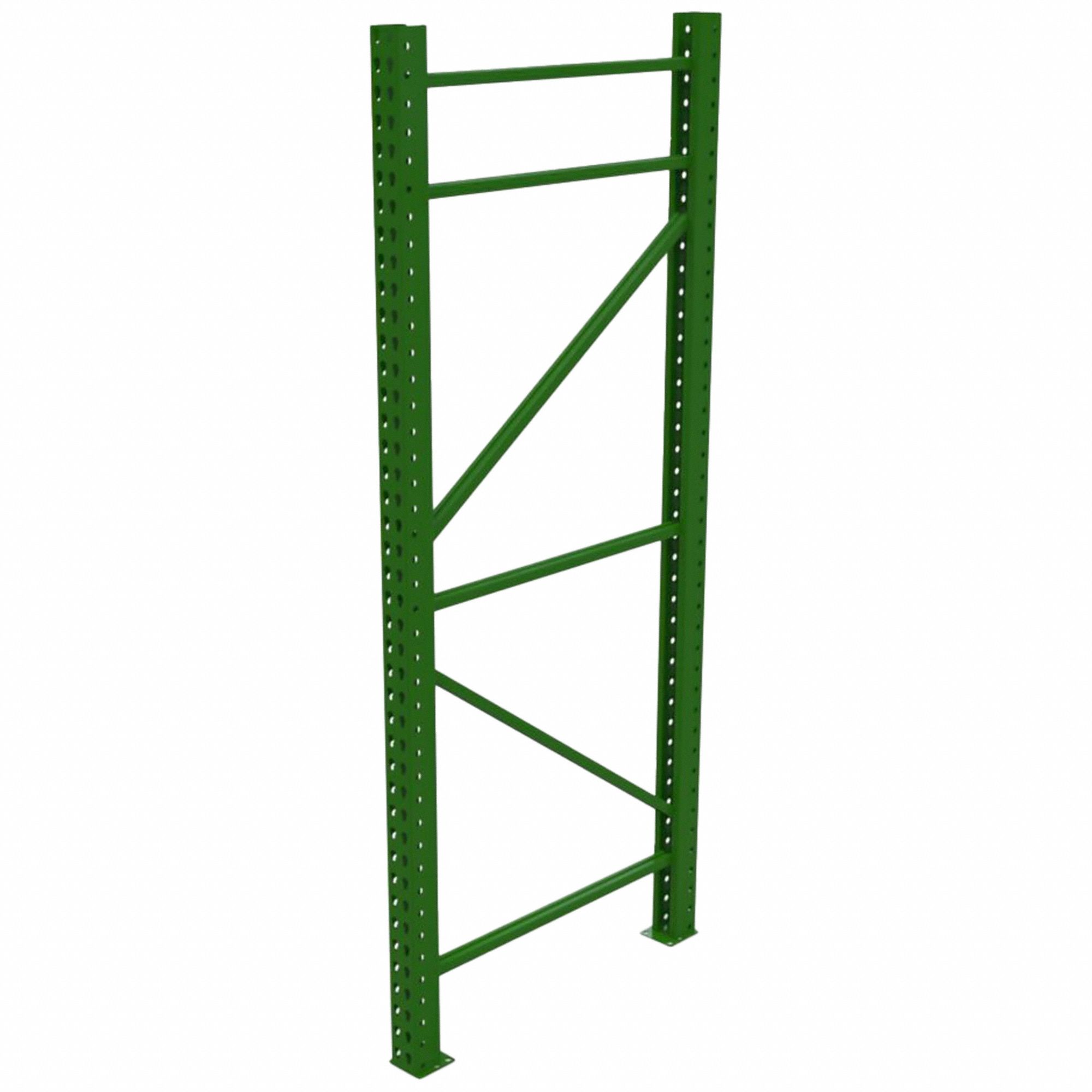 Welded upright frames include foot plates. Heavy-duty foot plates are available for seismic requirements. Upright frame capacities are calculated in accordance with RMI 1997 Standards. Upright frame style change as of April 2012; beams are interchangeable. Polyurethane paint finish. Color: green.