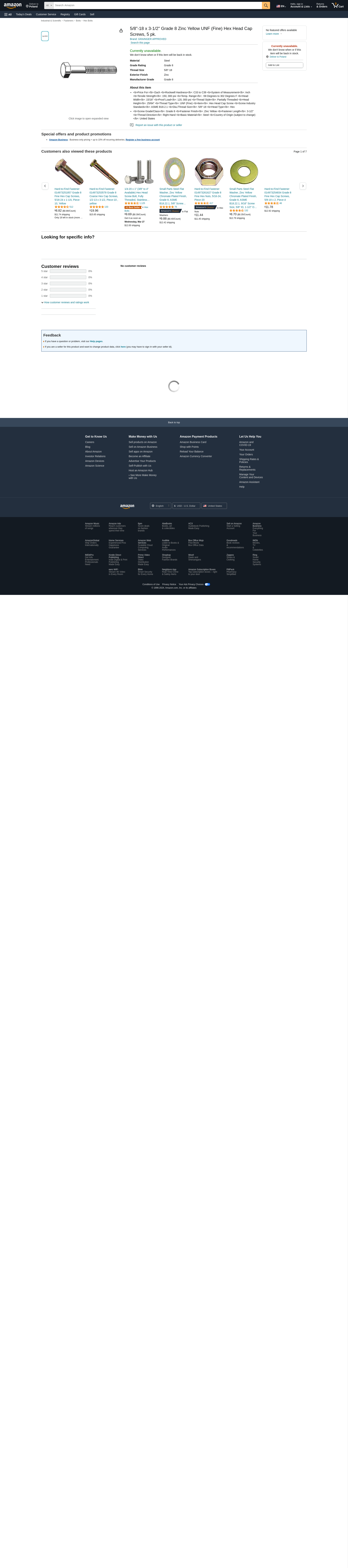 - <b>Screw Grade/Class</b>: Grade 8 <b>Fastener Finish</b>: Zinc Yellow <b>Fastener Length</b>: 3-1/2" <b>Thread Direction</b>: Right Hand <b>Basic Material</b>: Steel <b>Country of Origin (subject to change)</b>: United States