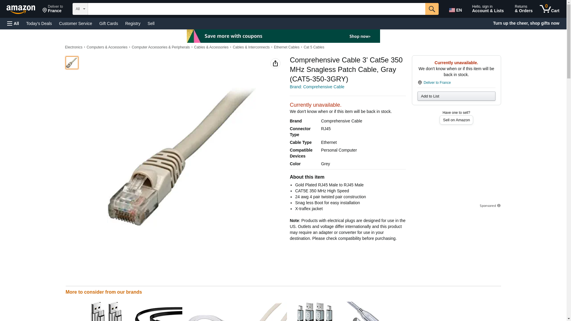 CAT5-350-3GRY Color: Gray Features: -Molded Boot. -Unshielded twisted pair (UTP). -UL rated and meets all 568A and 568B TIA/EIA standards. -3 feet long. Product Type: -Ethernet Cables. Length of Cable: -1' - 3'. Dimensions: Overall Length: -36 Inches.