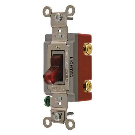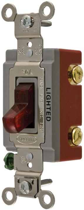 Hubbell HBL1221ILR Single Pole Toggle, Illuminated, Industrial Grade, 20 amp, 120/277V, Red