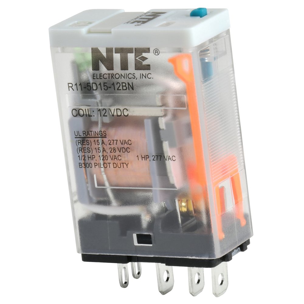 R11-5D15-12BN, Relay-15Amp SPDT 12Vdc with LED Indicator Locking Test Button Plug-in Mount