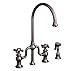 - Twisthaus bridge faucet with long gooseneck swivel spout, cross handles and solid brass side spray