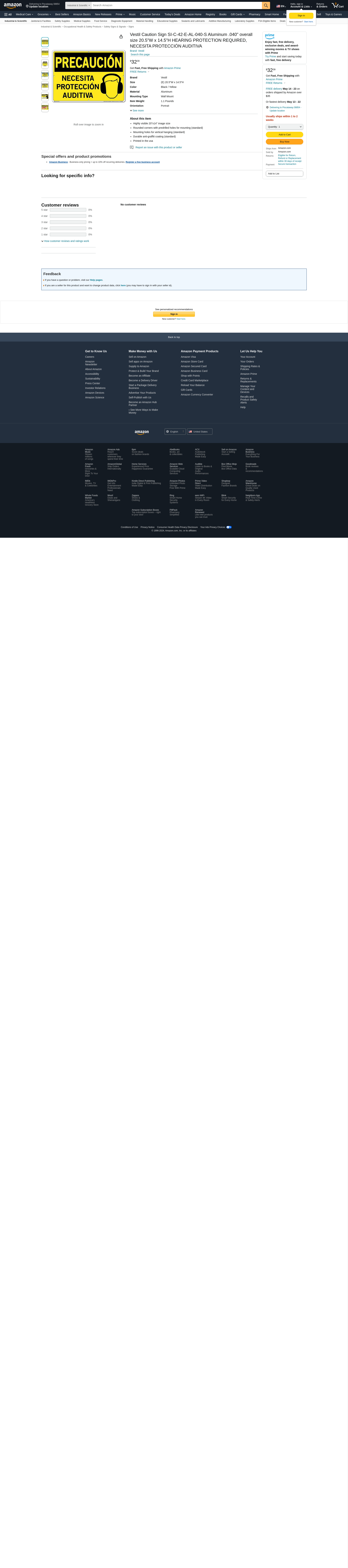 Vestil Caution Sign SI-C-42-E-AL-040-S Aluminum .040" overall size 20.5"W x 14.5"H HEARING PROTECTION REQUIRED, NECESITA PROTECCIÓN AUDITIVA