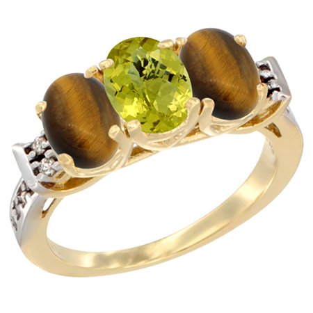 14K Yellow Gold Natural Lemon Quartz & Tiger Eye Sides Ring 3-Stone Oval 7x5 mm Diamond Accent, sizes 5 - 10