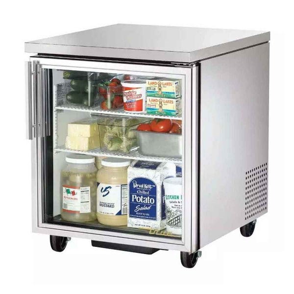 TUC-27G-HC-LD Undercounter Refrigerator 33-38 F (2) shelves stainless steel top sides white aluminum interior with stainless steel floor (1) Low-E glass door 5 castors front breathing R290 Hydrocarb