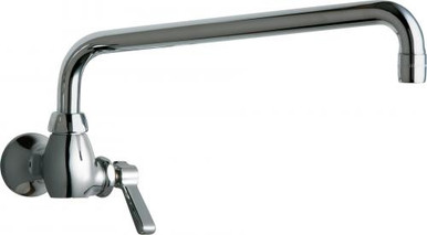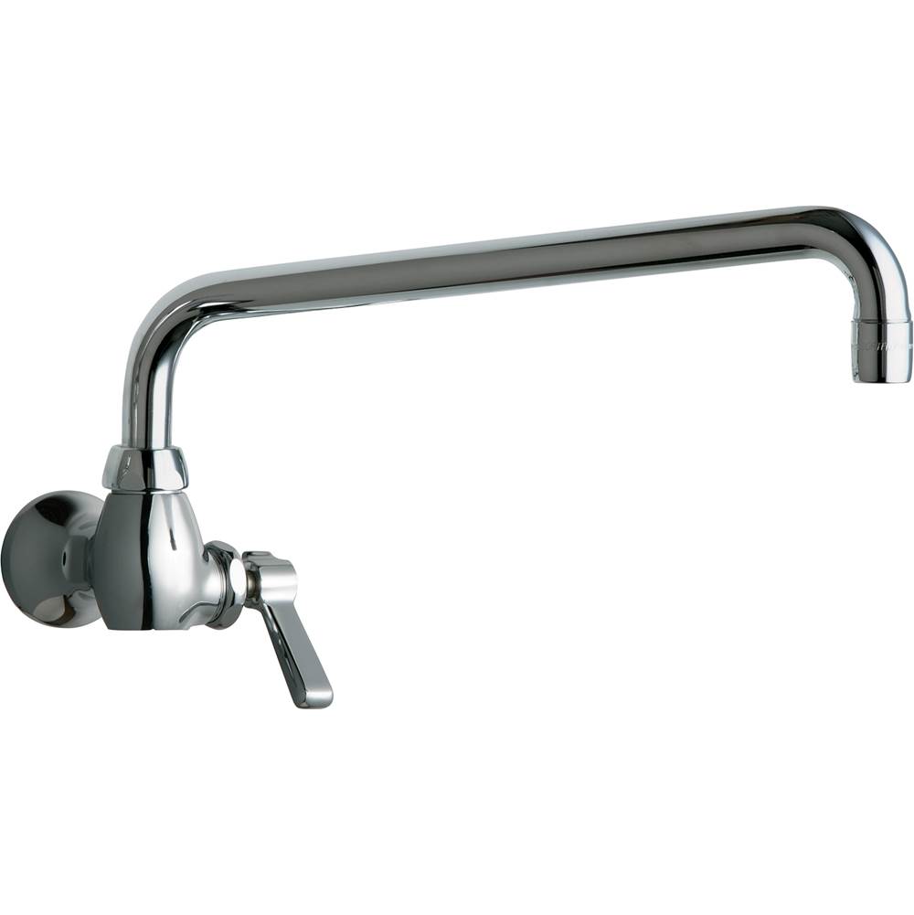 'Single-hole wall-mounted chrome-plated kitchen faucet has L-type 12" swing spout and 2.2 gpm (8.3L/min.) pressure compensating Softflo aerator. 2-3/8" metal vandal-proof lever handle with 16-point tapered broach and secured blue index button. Quaturnâ„ rebuildable compression cartridge, opens and closes 90°, closes with water pressure, features square tapered stem. 1/2" NPT female thread inlet with integral wall flange. ECAST construction with less than 0.25% lead content by weighted average. Polished chrome finish. ADA compliant. Complies with the requirements of the Buy American Act of 1933.'