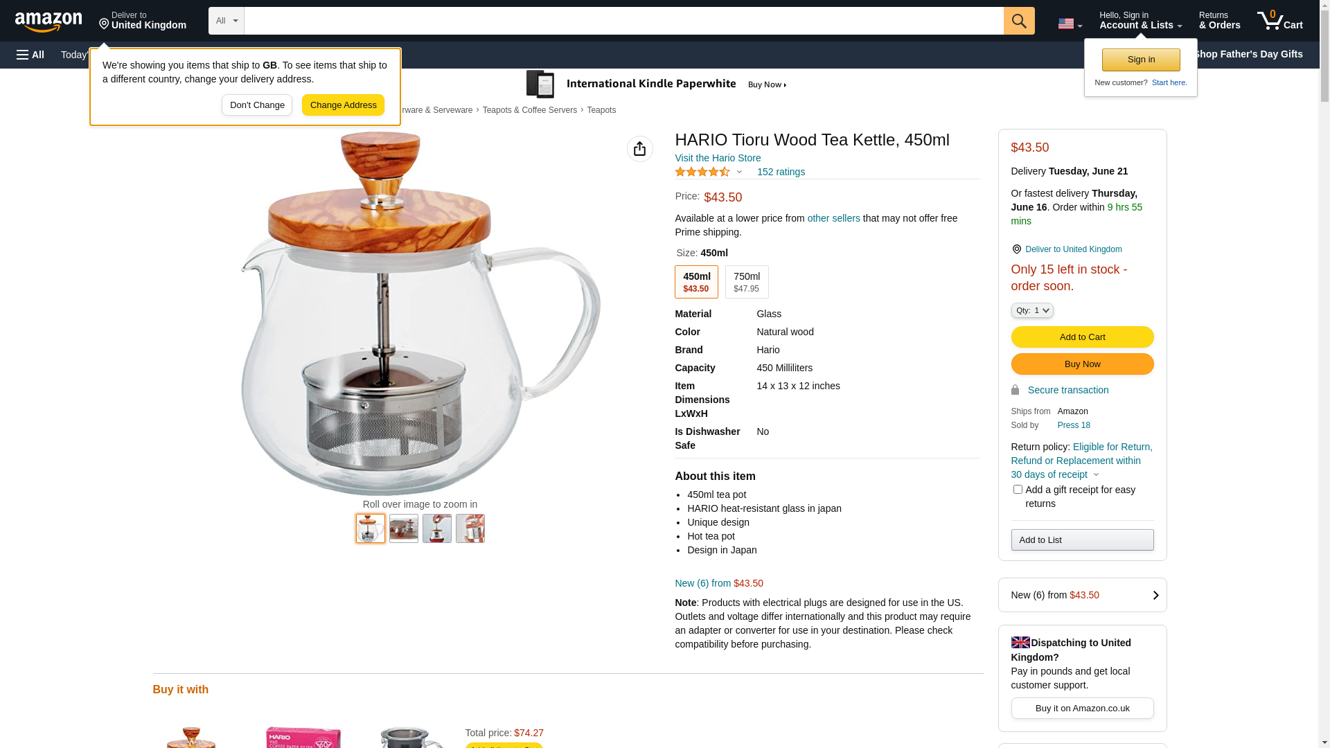 HARIO Tioru Wood Tea Kettle, 450ml