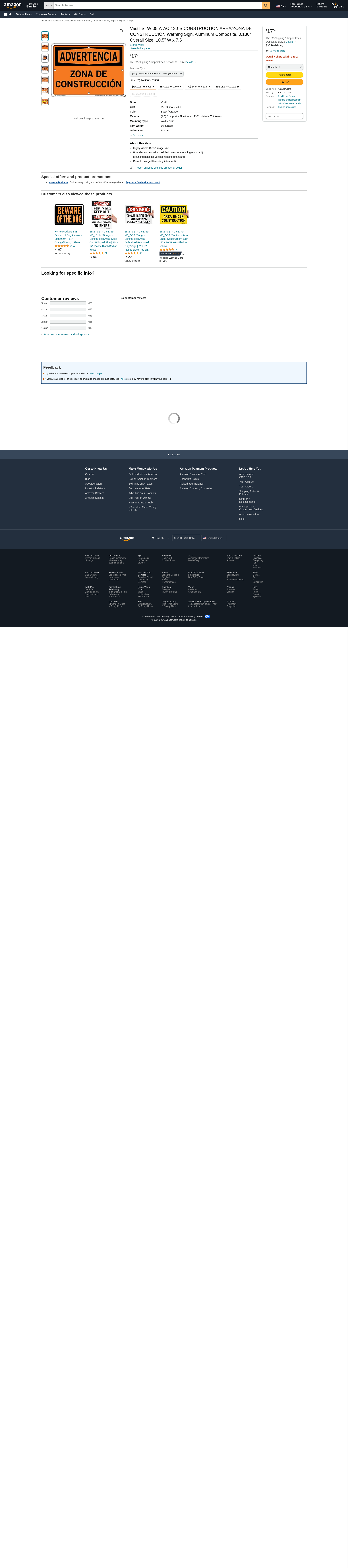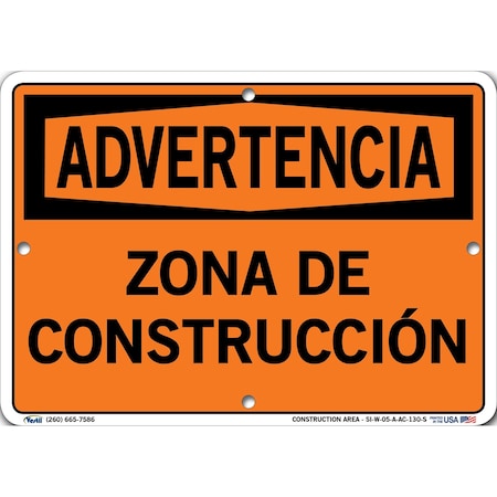 Vestil SI-W-05-A-AC-130-S CONSTRUCTION AREA/ZONA DE CONSTRUCCIÓN Warning Sign, Aluminum Composite, 0.130" Overall Size, 10.5" W x 7.5" H