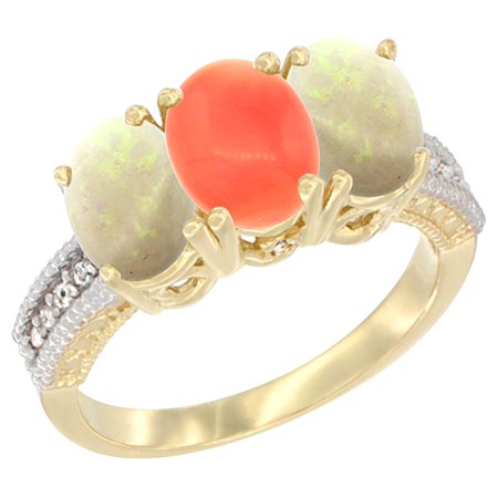 10K Yellow Gold Diamond Natural Coral & Opal Ring 3-Stone 7x5 mm Oval, sizes 5 - 10