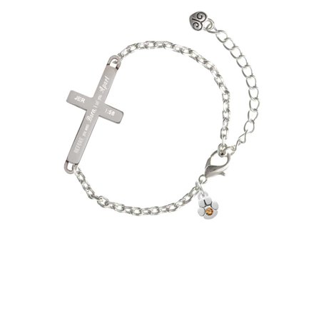 Bracelet is adjustable from 6.5 to 8 inches. Lobster claw clasp. Engraved Silvertone Cross is approx. 1.3 inches long.