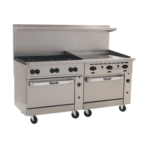 Vulcan 72CC-6B36GT 72" 6 Burner Gas Range w/ 36" Griddle, 2 OvensThis 72CC-6B-36GT Restaurant Range byVulcan is a durable unit that is found in many restaurant kitchens. This restaurant range has six burner with lift-off burner heads to easily transfer pa