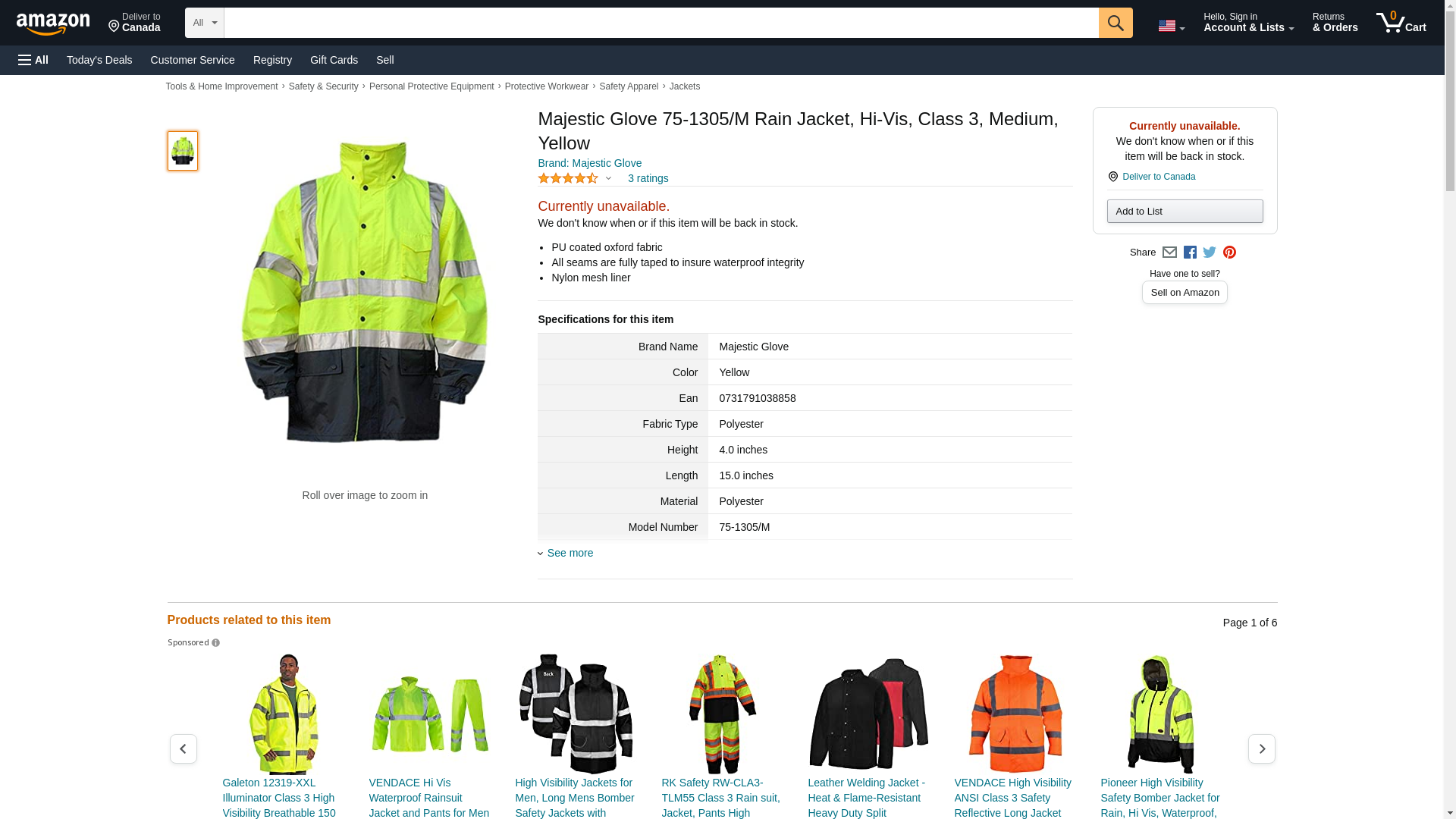 Majestic Glove 75-1305/M Rain Jacket, Hi-Vis, Class 3, Medium, Yellow