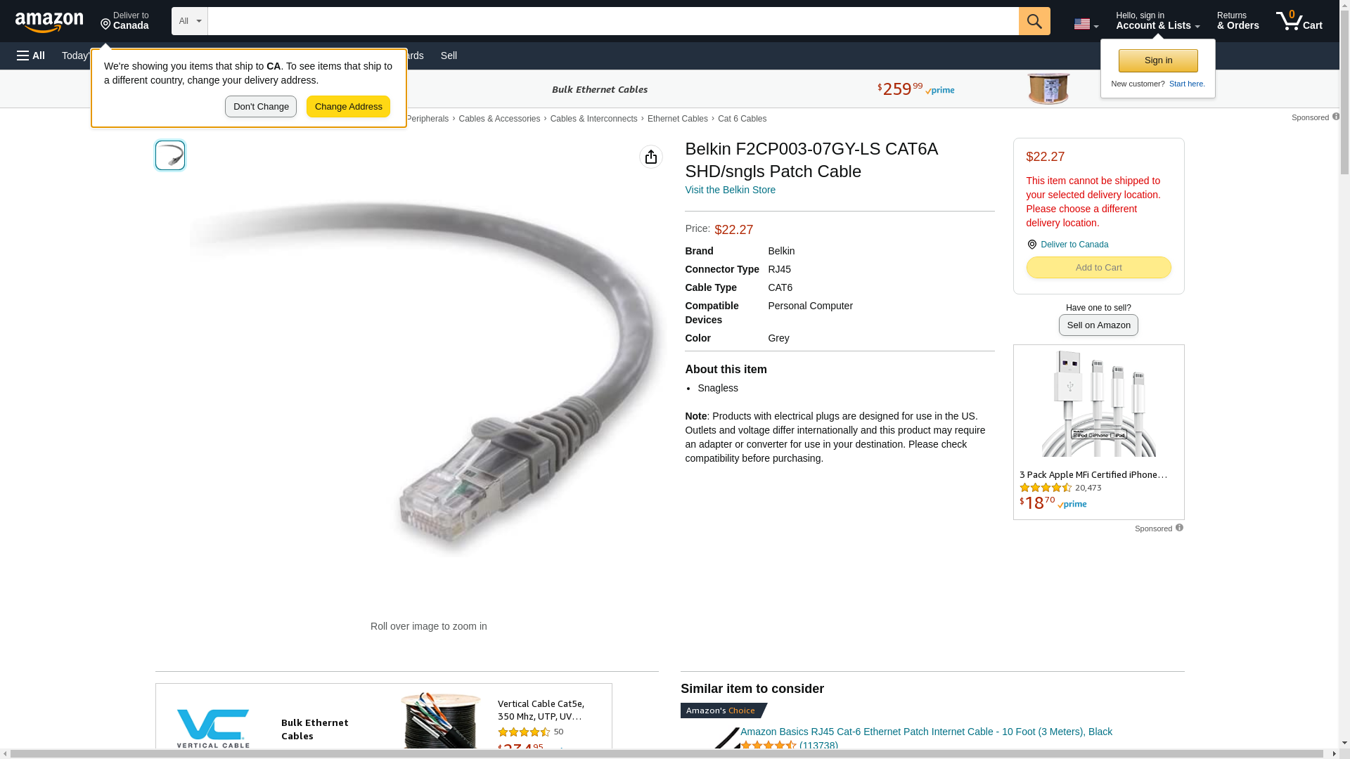 Belkin, 10G Patch Cable Rj-45 (M) Rj-45 (M) 7 Ft Cat 6A Molded, Stranded, Snagless Gray B2b "Product Category: Supplies & Accessories/Network Cables"