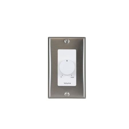 100 Watt Volume Control with Rotary Switch and One-Gang Wall Plate - Decora Stainless Steel & WhiteLowell's LVC Series volume controls are ETL Listed, compact easy-to-install controls that provide precise level adjustment of single or multiple speaker lines. Choose 25W, 50W or 100W mod- els with standard, Decora-st