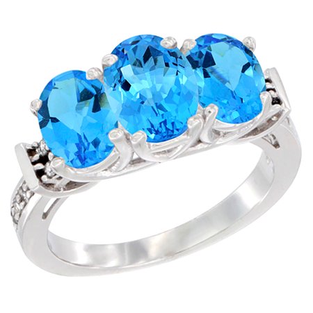 10K White Gold Natural Swiss Blue Topaz Ring 3-Stone Oval Diamond Accent, sizes 5 - 10