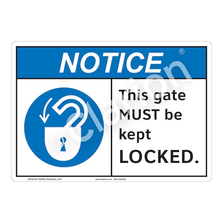 <p><strong>Word Message: </strong><br />This gate MUST be kept LOCKED. </p><p><strong>Description: </strong><br />Clarion Safety Systems brings you high quality notice this This gate MUST be kept LOCKED sign (ITEM# F1098-) which are produced on premium plastic material and are expertly designed to meet your door, gate and enclosure sign needs. </p><p><strong>Material Information:</strong></p> <ul> <li><strong>Material</strong>: (ZA) Indoor/Outdoor Flexible Polyester</li> <li><strong>Base Materials</strong>: 3M .002 premium white polyester</li> <li><strong>Overlaminate</strong>: 3M .002 matte vinyl</li> <li><strong>Mounting Option</strong>: 3M Premium Structured Acrylic</li> <li><strong>Application</strong>: Indoor/Outdoor</li> <li><strong>MaxTemp</strong> (F): 225</li> <li><strong>MinTemp</strong> (F): -20</li> <li><strong>Chemical Resistance</strong>: Excellent</li> <li><strong>UV Resistance</strong>: Good</li> <li><strong>Outdoor durability</strong>: Excellent</li> <li><strong>Storage Stability</strong>: Stable. Optimum storage conditions: 72 F @ 50% relative humidity</li> <li><strong>Expected Life Indoor</strong>: Long term</li> <li><strong>Expected Life Outdoor</strong>: 3-5 year (expected outdoor life may vary due to climatic conditions)</li> <li><strong>RoHS</strong>: Yes</li> <li><strong>CRoHS</strong>: Yes</li> <li><strong>REACH</strong>: Yes</li> </ul>