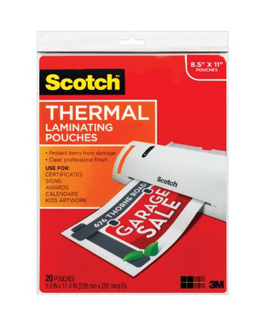 Scotch Thermal Laminator Pouches protect documents you handle frequently. These 3 mil thick thermal laminating pouches are for use with thermal laminators. Pouches are clear to let important information show through. Letter size for documents up to 8.5 x 11-Inch. Sold as 6 Pack