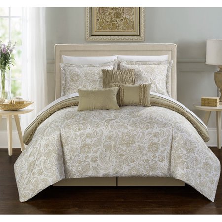 CHDE2570 <br /> <b>Features</b> <br /> <ul> <li>Twin contains 1 comforter, 1 sham, 3 decorative pillows and 1 bed skirt</li> <li>King/queen contains 1 comforter, 2 shams, 3 decorative pillows and 1 bed skirt</li> <li>Elle collection</li> <li>Reversible, 2 looks in one</li> <li>Beautiful vintage inspired floral design</li> <li>Amazing technique pleating details with matching decorative pillows</li> <li>Product Type: Comforter/Comforter set</li> <li>Color: Beige</li> <li>Pattern: Graphic Print & Text</li> </ul> <ul> <li>Number of Items Included (King): 7</li> <li>Pieces Included (King): 1 Comforter, 2 shams, 3 decorative pillows and 1 bed skirt</li> </ul> <ul> <li>Number of Items Included (Twin): 6</li> <li>Pieces Included (Twin): 1 Comforter, 1 sham, 3 decorative pillows and 1 bed skirt</li> </ul> <br /> <b>Dimensions</b> <br /> <ul> <li>1 Decorative pillow: 18 " L x 18" W and 2 decorative pillow: 12" L x 18" W</li> </ul> <br />Size King <br /> <ul> <li>Duvet Cover/Comforter Width - Side to Side: 104"</li> </ul> <br />Size Queen <br /> <ul> <li>Duvet Cover/Comforter Length - Head to Toe: 90"</li> <li>Duvet Cover/Comforter Width - Side to Side: 90"</li> </ul> <br />Size Twin <br /> <ul> <li>Duvet Cover/Comforter Length - Head to Toe: 86"</li> <li>Duvet Cover/Comforter Width - Side to Side: 66"</li> </ul>
