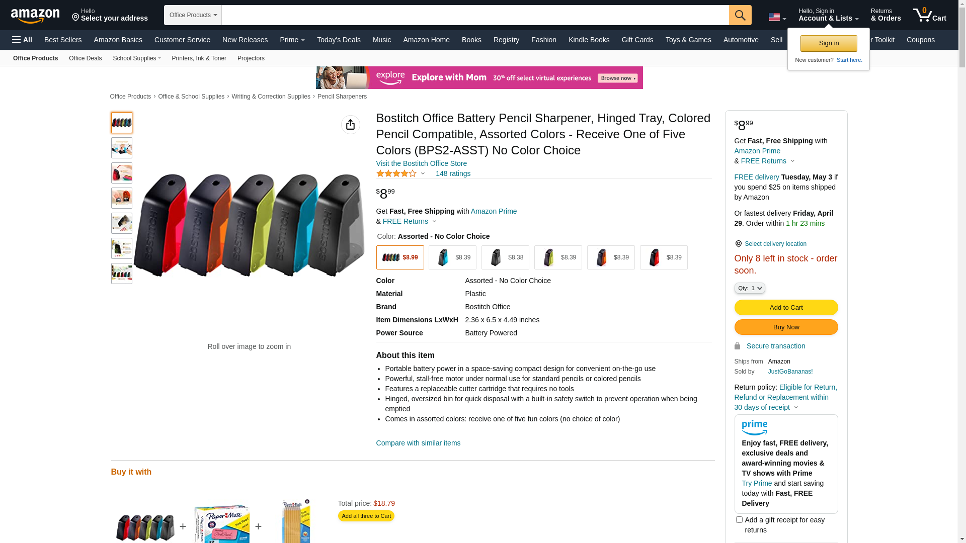 Bostitch Office Battery Pencil Sharpener, Hinged Tray, Colored Pencil Compatible, Assorted Colors - Receive One of Five Colors (BPS2-ASST) No Color Choice