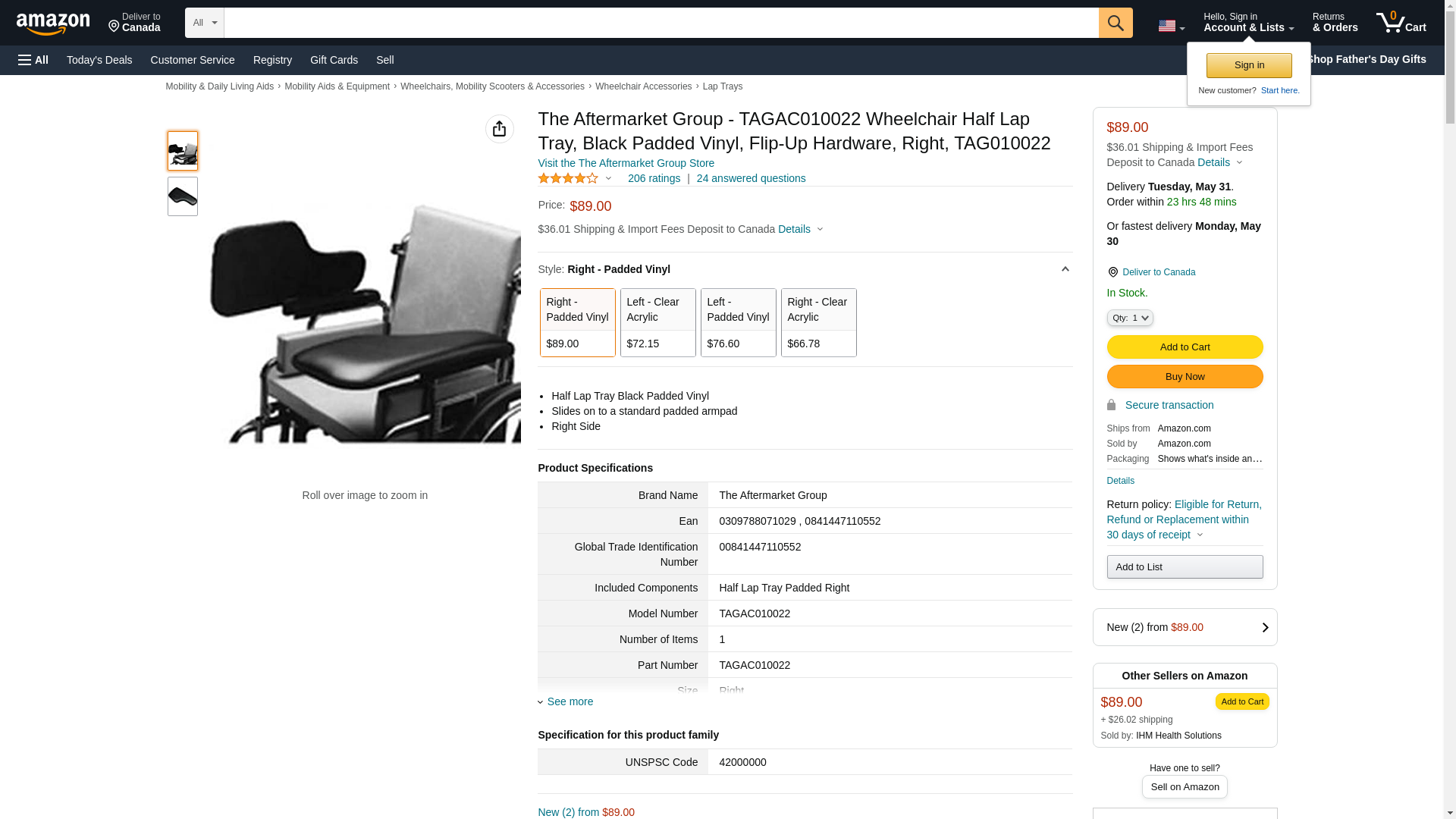 The Aftermarket Group - TAGAC010022 Wheelchair Half Lap Tray, Black Padded Vinyl, Flip-Up Hardware, Right, TAG010022