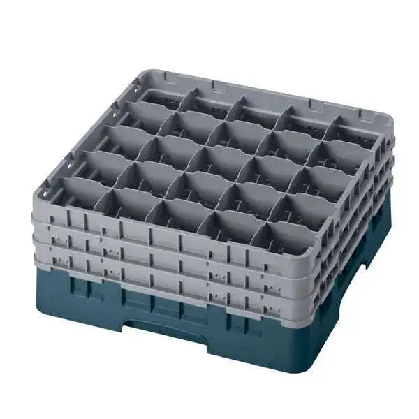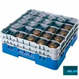 This full-size Cambro Camrack glass rack provides you with the perfect solution to wash, store and safely transport your stemware and tumblers. Its open inside compartments ensure thorough circulation of water and cleaning solutions and promotes quick and thorough drying. Closed external walls keep fingers safe, contaminants out and reduces the risk of injury and breakage. The Camrack glass rack features easy-to-grip, rounded handles on all four sides for comfortable handling. A smooth top rim ensures quick, stable stacking plus the rack can inter-stack with other competitive racks. The teal glass rack is made of durable, long-lasting polypropylene that will withstand chemicals and high temperatures up to 200°F (93.3°C). Fits any commercial dishwasher. Add a Camdolly and Cover for completely-enclosed, sanitary storage between use. - Camrack Full-Size Glass Rack- 25 Compartments, 3 extenders- Open inside compartments, closed exterior walls - Easy grip rounded handles on all sides- Durable, polypropylene construction- Fits any commercial dishwasher- Teal with soft gray extenders- Stackable- NSF Certified- Compartment Size: 3-1/2in Dia x 7-3/4in H- Dimensions: 19-3/4in W x 19-3/4in L x 8-7/8in H*Please Note: Additional compartment extenders cannot be added to this item.*