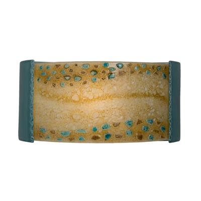 Finish:Teal Crackle/Multi Amber, Light Bulb:(1)60w B10 Cand F Incand The main feature of this piece is the visual fluidity of motion created by the meandering bands of fused pieces of colored glass along the top and bottom edge and uncolored pieces of glass along the middle. A crescent-shaped horizontal sconce. Light shines through openings at the top, the bottom and illuminates the textured ebb-and-flow design. Handmade to A19s exacting standards, using a kiln-fired ceramic base and recycled window glass from local sources.