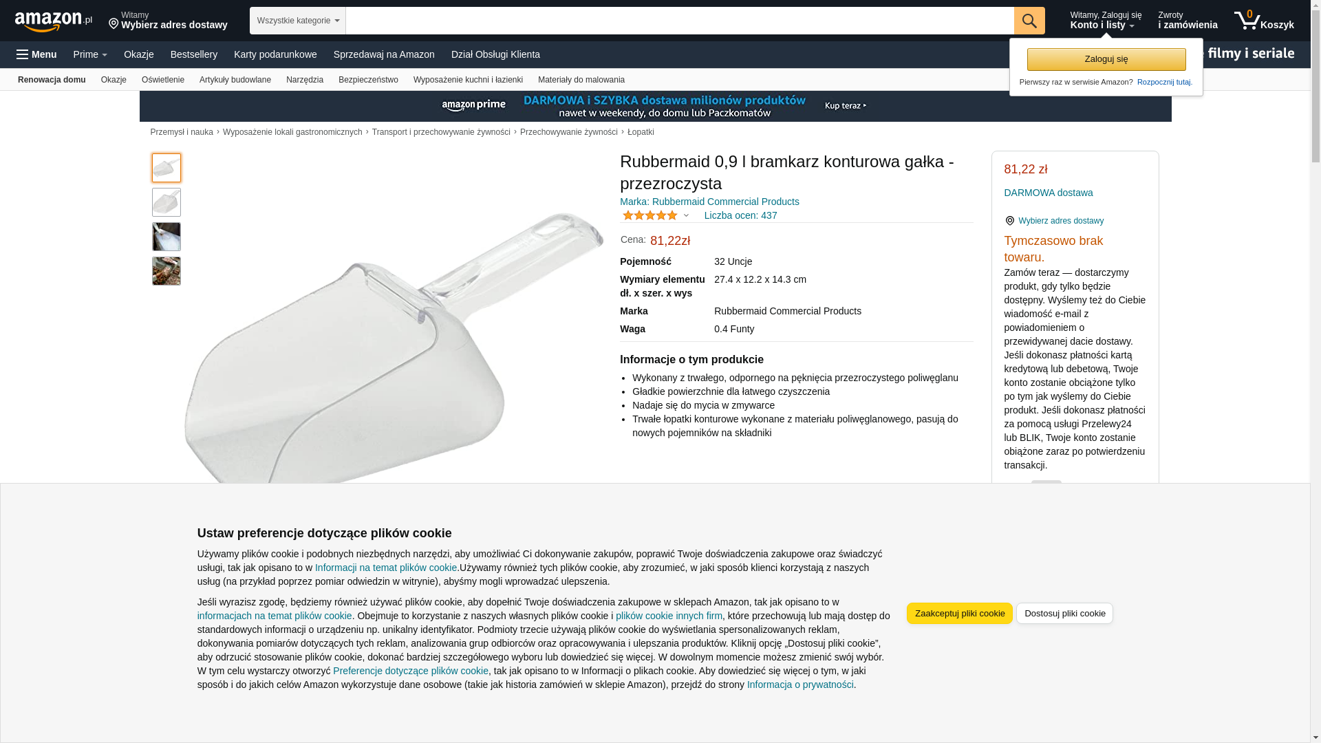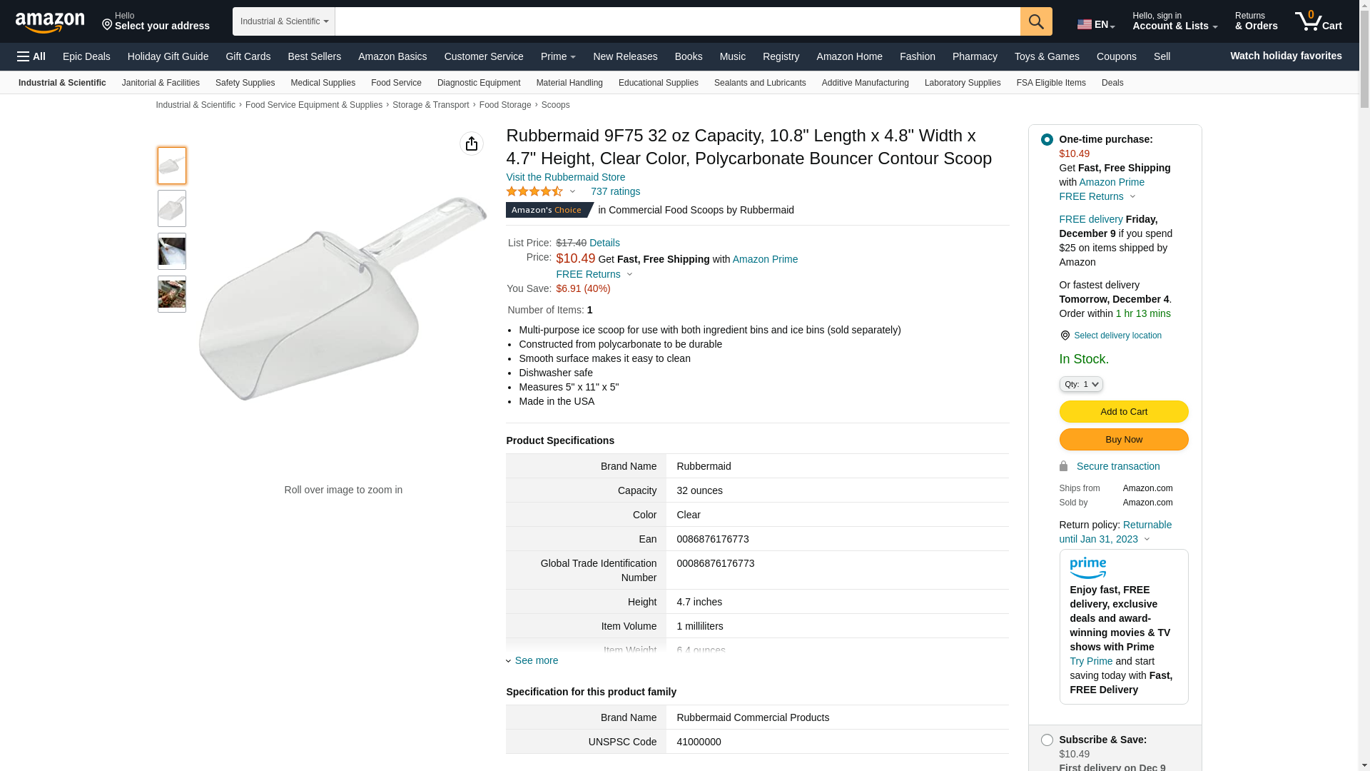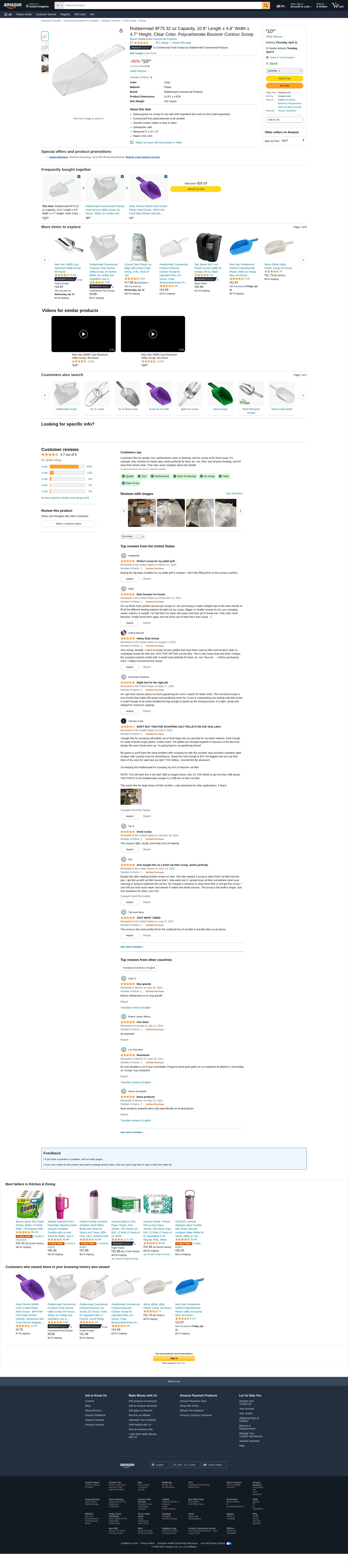 Rubbermaid 9F75 32 oz Capacity, 10.8" Length x 4.8" Width x 4.7" Height, Clear Color, Polycarbonate Bouncer Contour Scoop