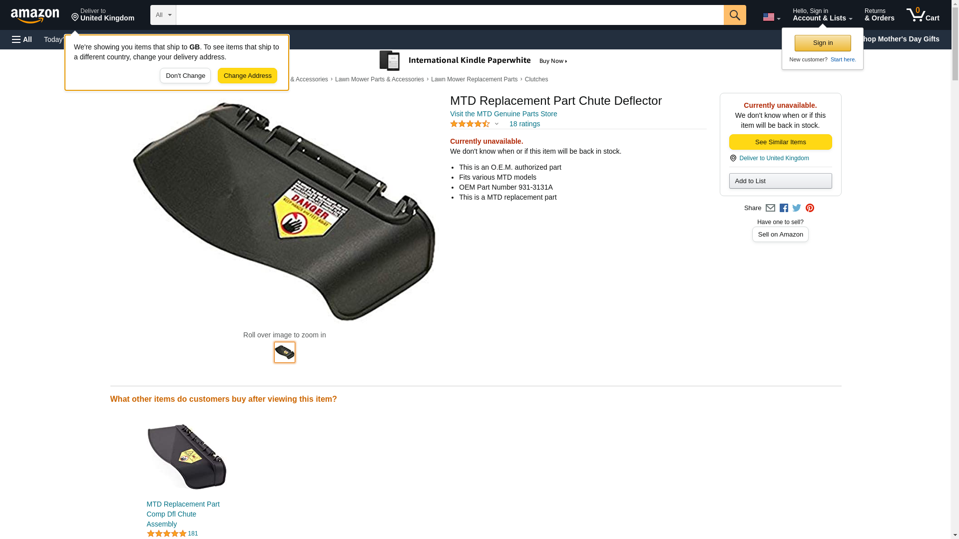 CUB CADET 931-3131A Deflector Chute 365 RZT50 LT1050 GT1554 SLT1554 RZT22 LT1024 GT2554 RZT-50 RZT-22 Z48 ZT54 4815F