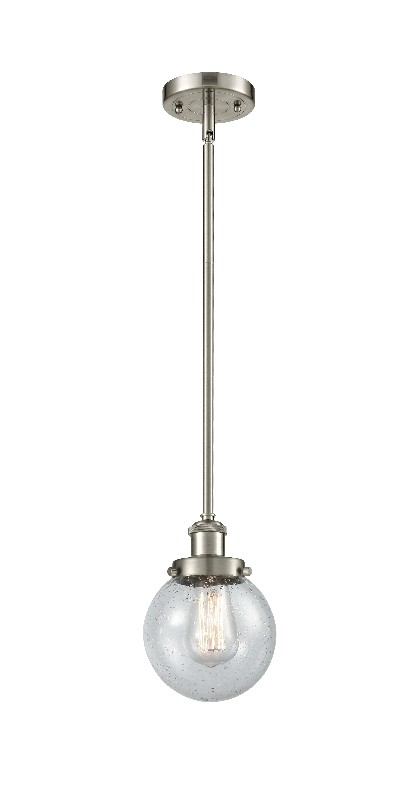 INNOVATIONS LIGHTING 916-1S-SN-G204-6-LED Beacon 1 Light Pendant part of the Ballston Collection. Collection: Ballston. Metal Finish (Body): Brushed Satin Nickel. Metal Finish (Canopy/Backplate): Brushed Satin Nickel. Glass or Metal Shade Color: Seedy. Material: Steel, Cast Brass, Glass. Shade Material: Glass. Dimension(in): 9(H) x 6(W) x 6(Dia). Canopy Dimension(in): 0.75(H) x 4.5(Dia). Min/Max Height(With Shade, Cord or Included Stems & Canopy)(in): 17.75/41.75. Shade Size(in): 6(H) x 6(Dia). Bulb: (1) 3.5 Watt LED Vintage Medium Base Bulb Included. Voltage: 120. Dimmable: Yes. Color Temperature(Kelvin): 2700. CRI: 82. Lumens: 350. Sloped Ceiling Compatible: Yes. Glass Type: Seeded. Glass or Metal Shade Shape: Sphere. Shade Fitter Measurement: Neckless with a 2.125 inch Hole. Style: Modern Contempo, Transitional . Ul Certification Type: Damp Location. Warranty: 2 Year Finish, Lifetime Electrical.