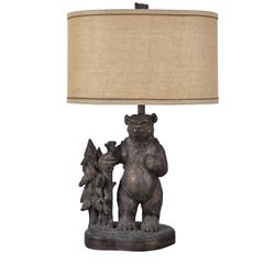 Bring a rustic presence to your home when you use the Trail Hike oil-rubbed bronze table lamp from the Crestview Collection brand. The resin construction features an oil-rubbed bronze finish and a bear wearing a backpack standing next to some trees. A burlap shade completes the overall rustic aesthetic.