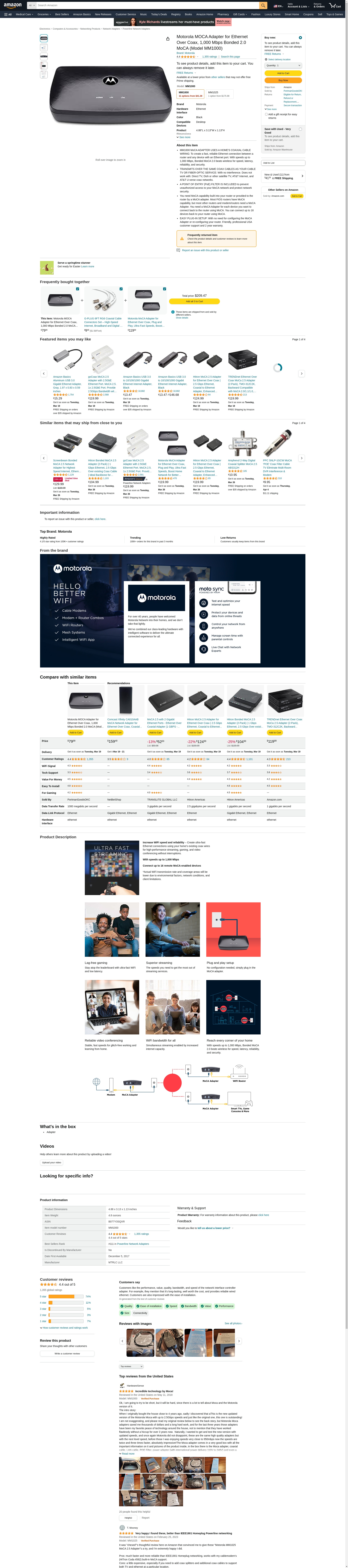Motorola MOCA Adapter for Ethernet Over Coax, 1,000 Mbps Bonded 2.0 MoCA (Model MM1000)