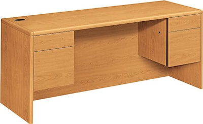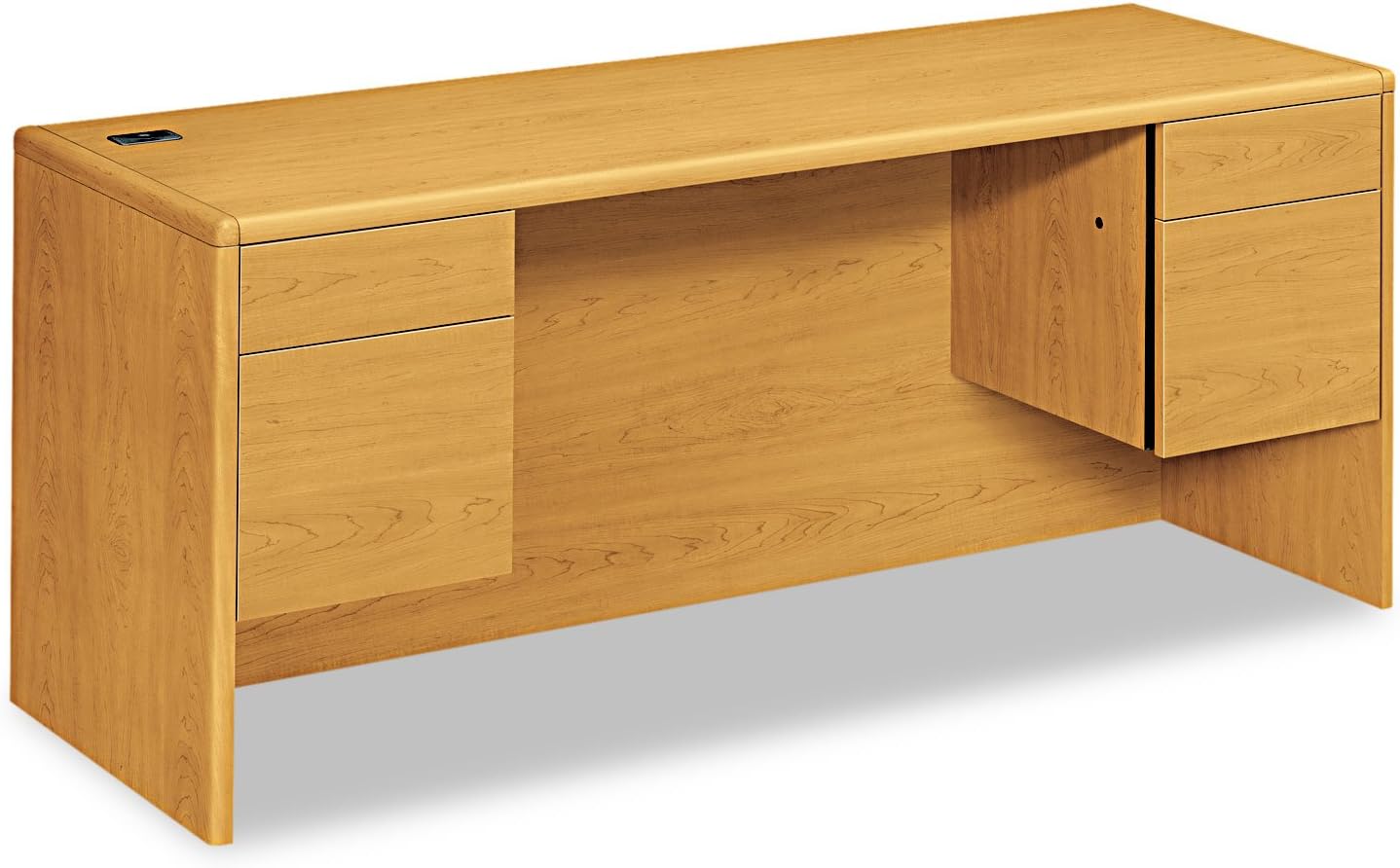A modular management solution that combines stylish profiles and elegant accents with top-grade fit and finish. Laminate with rounded corners and waterfall edge. Full-extension file drawers and 3/4-extension box drawers ride on steel ball bearing suspensions. Hang rails accommodate letter and legal size hanging files. Two cord management grommets. HON "One Key" core removable locks. Color: Harvest; Pedestal Count: 2; Drawer Configuration: Left: Box/File; Right: Box/File; Overall Width: 72".