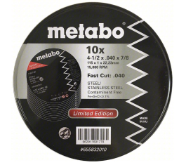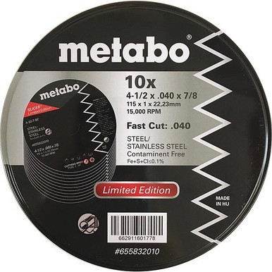 <p><strong>Metabo 655832010 4-1/2"x .040 x 7/8" A60T Type 1 Slicer Cutting Wheels - 10 Pack</p></strong><p>10 pack of Slicer Cutting Wheels in a Tin. The Metabo Original Slicer A 60, aluminum oxide wheel for steel and other ferrous metals has an extremely fast rate of cut with a good cutting wheel life. Excellent service life!</p><p><strong>Features:</strong></p><ul><li>For general purpose cutting of stainless steel, carbon steel, aluminum</li><li>Fast cool cutting allows operator to work with minimum pressure</li><li>Reduced heat affected zone during cutting minimizes burr creation</li><li>Highly refined ingredients will not contaminate stainless steel</li><li>Excellent wheel life due to the addition of zirconia to the grain</li><li>Ultra thin design minimizes material loss during cutting</li></ul>
