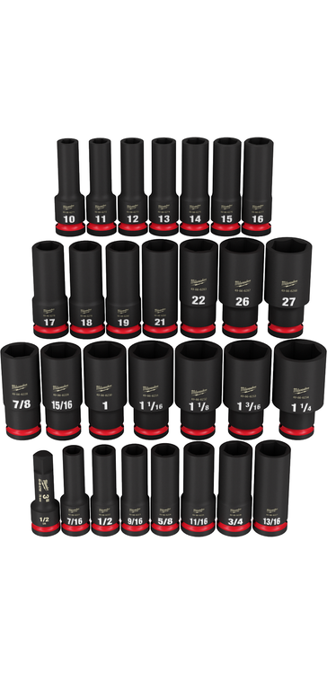 - Kit includes 28 deep SAE and metric sockets and 1 extension, the following sizes are included: 7/16, 1/2, 9/16, 5/8, 11/16, 3/4, 13/16, 7/8, 15/16, 1, 1-1/16, 1-1/8, 1-3/16, 1-1/4, 10, 11, 12, 13, 14, 15, 16, 17, 18, 19, 21, 22, 26, 27, and one 3 in. extension