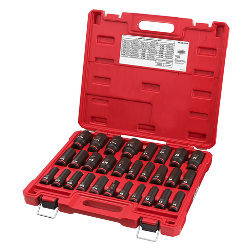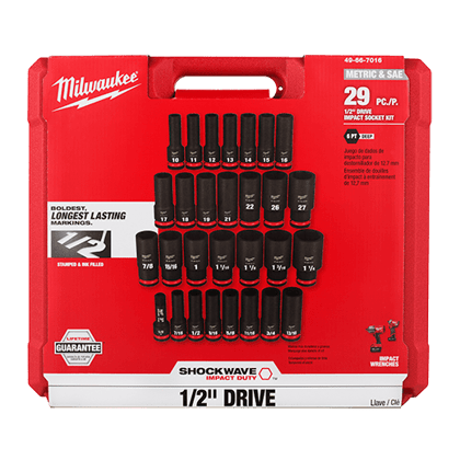 The Milwaukee 29-Piece SHOCKWAVE Impact Duty 1/2 in. Drive SAE and Metric Deep 6 Point Socket Set features the boldest, longest-lasting markings and extreme impact durability in high torque applications. The stamped and ink-filled size marking enables users to select the right socket every time throughout the life of the socket. These Milwaukee sockets are engineered with high strength forged steel for optimized performance in heavy-duty applications. The non-slip hex geometry prevents fastener rounding, and a dual-hole design and ring groove allow for easy socket attachment and removal. The storage cases are impact resistant and nest together for easy stacking and storage. All SHOCKWAVE Impact Duty Sockets backed by a Lifetime Guarantee and meet ASME industry standards.