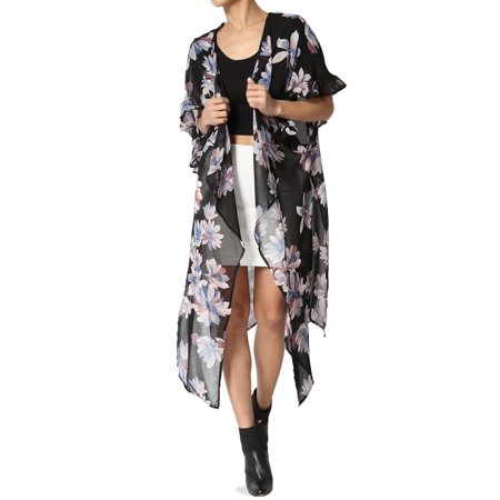 <ul> <li>Allover floral print chiffon</li> <li>Open front, slit asymmetric hem</li> <li>Ruffled short sleeves, unlined, sheer</li> <li>Measurement : S-Chest: 44in, Length: 43in | M-Chest: 46in, Length: 43.5in | L-Chest: 48in, Length: 44in</li> <li>Model size : 5'3" height, 33" bust, 24" waist, 34" hip, and is wearing a size S, Fits true to size, take your normal size</li> <li>100% polyester</li> <li>Made in United States</li> </ul>