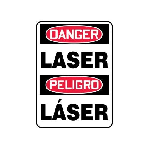 Bilingual Safety Signs (English & Spanish) - Laser, 20" x 14". Versatile, Stick-nearly-anywhere vinyl sign and with UV protection. Adhesive Dura-Vinyl is a custom sign material with dual-layered vinyl that outperforms standard vinyl. Printed image is protected by a high-gloss, 1-mil, UV-resistant polyester over-laminate. Guaranteed for 5 years.<br><br>Flexible poly-composite material with UV protective laminate is resistant to abrasions, humidity, chemicals, solvents, and fading from sunlight. Permanent, acrylic adhesive back with peel-off liner adheres to smooth, curved, and irregular surfaces. <br>Service temperature range is -40 to 176F.