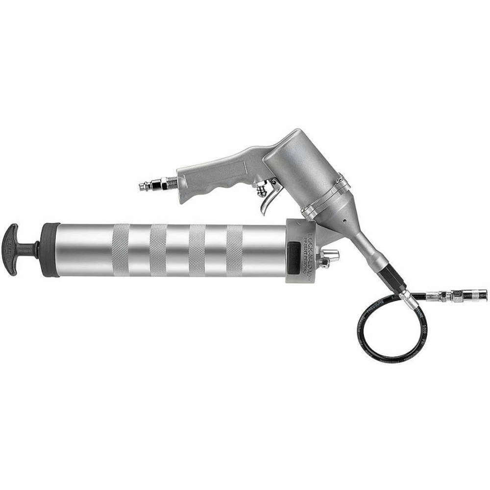 - Price For: Each Bulk Capacity: 16 oz. Features: Lock-n-Load Barrel System, Automatic Bleeder Application: For 14 1/2 oz Cartridge, 16 oz Bulk Grease Type: Up to and Including NLGI Grade 2 Greases Item: Air-Operated Grease Gun Includes: Four Jaw Coupler Pressure Ratio: 40:1 Tube Color: Gray Single Shot / Continuous Shot: Single Shot Nozzle Extension Type: Rigid Pipe and Flex Hose