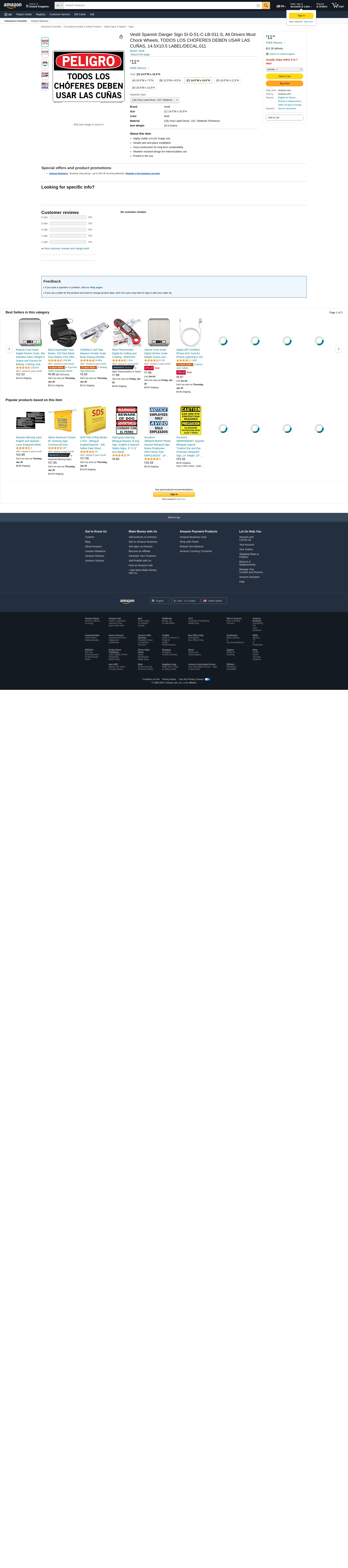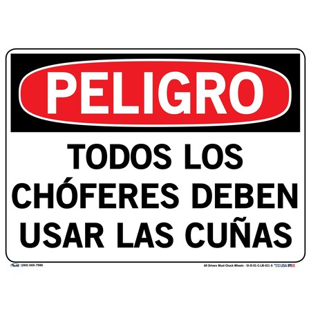 Vestil Spanish Danger Sign SI-D-51-C-LB-011-S, All Drivers Must Chock Wheels, TODOS LOS CHÓFERES DEBEN USAR LAS CUÑAS, 14.5X10.5 LABEL/DECAL.011