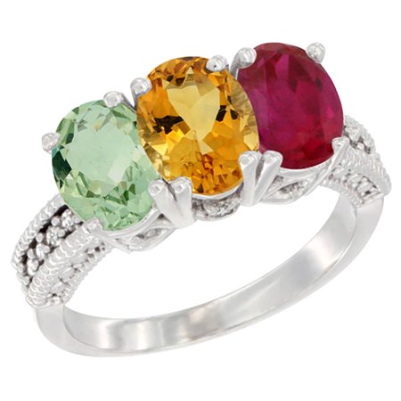 14K White Gold Natural Green Amethyst, Citrine & Enhanced Ruby Ring 3-Stone 7x5 mm Oval Diamond Accent, sizes 5 - 10
