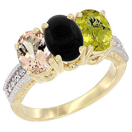 10K Yellow Gold Natural Morganite, Black Onyx & Lemon Quartz Ring 3-Stone Oval 7x5 mm, sizes 5 - 10