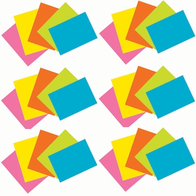 Organize notes, files, project lists and contact information with index cards. Sturdy tagboard. Super Bright assorted 5 colors: Hot Pink, Hot Yellow, Hot Blue, Hot Orange and Hot Lime. Recyclable. Unruled. Measures 4" x 6". Each pack includes 100 index card. Sold as a set of 6 packs, 600 index cards total. Index Cards. 4" x 6". 5 Super Bright Assorted Colors, Unruled. 100 Cards Per Pack, 6 Packs.
