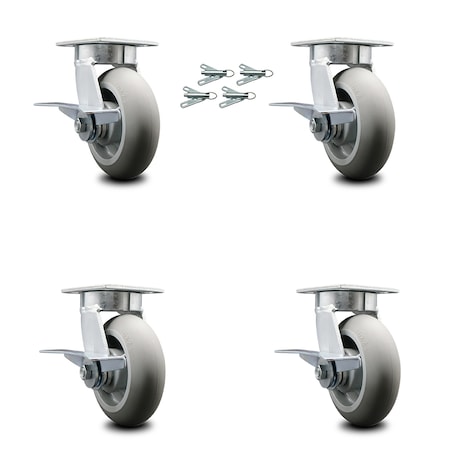 Kingpinless Thermo Rubber Donut Tread Swivel Top Plate Caster Set of 4 w/6" x 2" Gray Wheels - Includes 4 Swivel w/Side Lck Brakes & Bolt on Swivel Locks-2000 lbs Total Capacity - Service Caster Brand