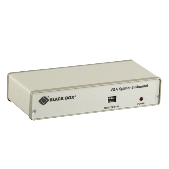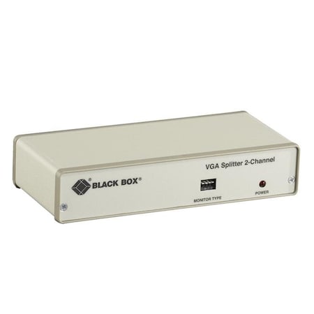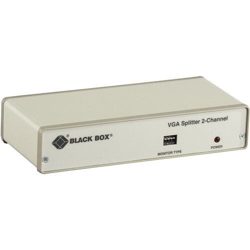 Take the message from a PC to multiple VGA monitors. Package Contents: VGA 2-Channel Video Splitter, 115-VAC 1 x 6-Foot (1.8-m) VGA Input Cable Product Type: Video Switchbox Product Type: Video Switchbox Manufacturer Part Number: AC056A-R4 Limited Warranty: 3 Year Weight (Approximate): 2.50 lb Connectivity Technology: Cable Connectivity Technology: Cable Manufacturer: Black Box Corporation Product Name: VGA 2-Channel Video Splitter, 115-VAC Brand Name: Black Box Brand Name: Black Box Country of Origin: United States Height: 1.5 Width: 7.3 Depth: 3.3 Maximum Operating Distance: 250 ft VGA In: Yes VGA Out: Yes Number of Displays Supported: 2 Number of Input Devices Supported: 1 Graphics Modes: XGA Graphics Modes: VGA Environmentally Friendly: Yes Environmental Certification: WEEE Environmental Certification: RoHS Maximum Operating Distance: 250 ft Number of VGA Outputs: 2 VGA In: Yes VGA Out: Yes Number of Displays Supported: 2 Number of Input Devices Supported: 1 Number of VGA Inputs: 1