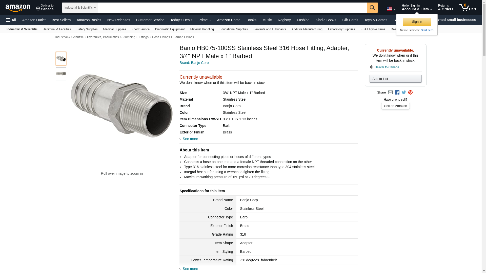 Banjo HB075-100SS Stainless Steel 316 Hose Fitting, Adapter, 3/4" NPT Male x 1" Barbed