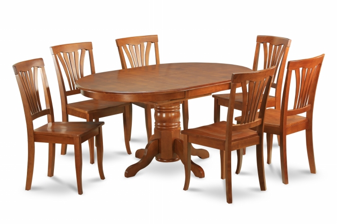 East West Furniture AVON7-SBR-W 7PC Oval Dining Set with Single Pedestal with 18 in. leaf and 6 wood seat chairs in Brow