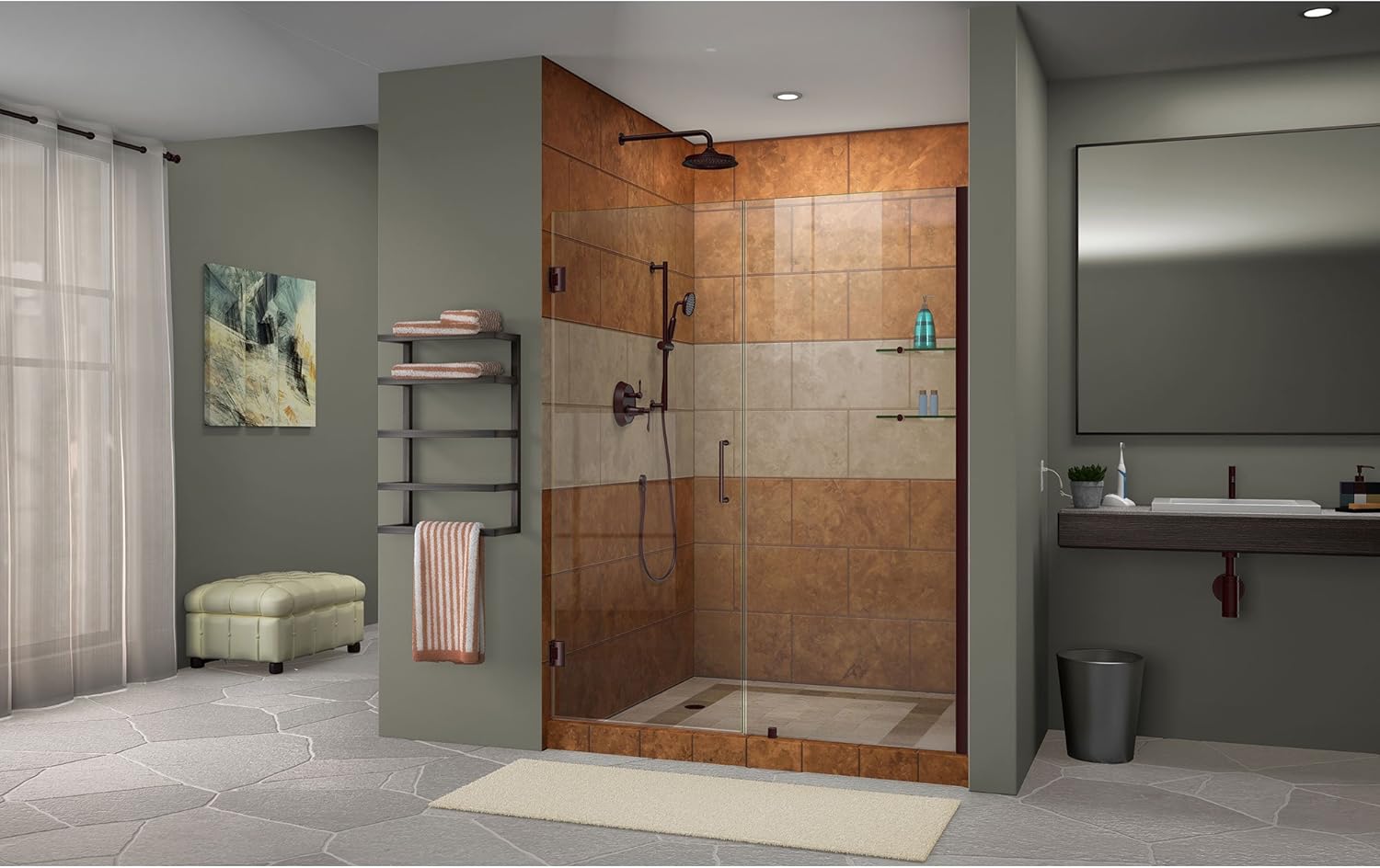 DreamLine Unidoor 47 to 48" Frameless Hinged Shower Door, Clear 3/8" Glass Door, 24" Stationary Panel w/ Shelves, Oil Rubbed Bronze Finish Hardware