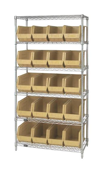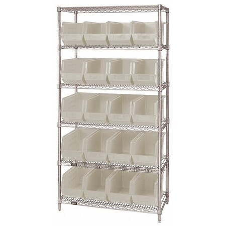 Quantum Storage Systems WR6-265IV 6-Tier Complete Wire Shelving System with 20 QUS265 Ivory Giant Open Hopper Bins, Chrome Finish, 18" Width x 36" Length x 74" Height